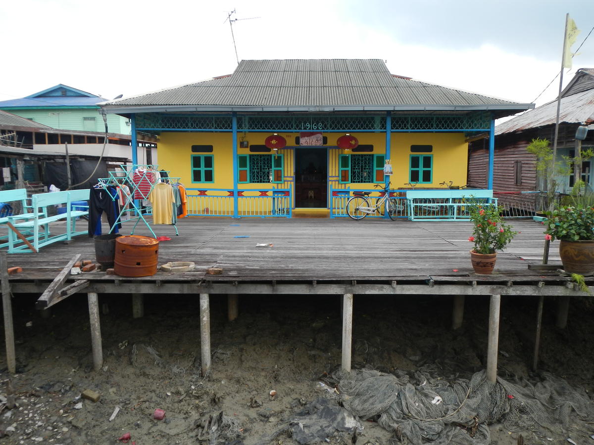 Le soir même, j'ai une réponse de Baloo qui accepte de m'héberger en urgence. Le lendemain, avant de retrouver Baloo en soirée, Vincs me conseille, plutot que d'aller en centre ville, d'aller visiter Pulau Petang (île aux crabes) car c'est près de l'école de musique, et l'appart de Balloo est à mi chemin entre l'école et le centre ville. Pulau Petang est une île de pécheurs où les engins à moteurs (thermique) sont interdit : tout le monde à pattes ou en byciclette! Tout est construit sur piloti, on marche un coup au dessus de la boue, un coup au dessus des flots, tout dépend de la marée.