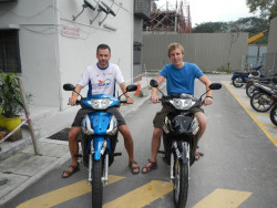 Quand Philippe arrive, nous avons besoin de temps pour nous préparer. Finalement, il ne partira pas avec sa Keeway, une vrai moto 200c mais il partira avec la même moto que moi. Nous achetons donc deux Honda Wave 125cc d'occasion à AHM motorsports pour 6500R (1600€). C'est un gros investissement pour moi, bien plus que prévu car sur internet, les gens parlent souvent d'acheter au vietnam pour 300€ (pas 800) mais personne ne parle de la Malaisie. Mais ici, l'occasion ne décote pas beaucoup et reste donc très cher. Chose étrange aussi, ils ne se fient qu'à l'année de production, pas au km... donc si on les revend en bonne condition dans 4 mois, on ne devrait presque rien perdre dessus. L'essence ne coûtant même pas 2 R/l (50c€), et la moto ne consommant que 2l/100km, j'en ai pour moins d'1€ au 100km.