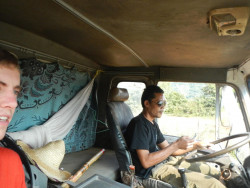 Je passerais un peu plus de 40h avec ce Chinois qui me fera traverser un peu plus des deux tiers du pays, tout frais payé, toujours invité par l'un des chauffeurs du convoi. Ils viennent de Kunming en Chine et transportent du matériel nécessaire pour l'agrandissement de la cimenterie du Laos. Le premier soir, on s'arrète près d'un bar pour boire un coup. Les chauffeurs ne parlent pas le lao, les Laotiens ne parlent pas mandarin. Je suis le seul à pouvoir communiquer en anglais avec Wu, le fils des patron, un jeune Laotien de 17 ans qui éudie l'anglais en sus de ses heures de cours à l'école. Après quelques verres, il me demande "do you want a girl?". Là, je repense au seul panneau d'affichage qu'il y avait accroché à la bicoque qui sert de poste frontière, expliquant aux rares touristes, que le tourisme sexuel, c'est mal. Et le gamin de 17 ans qui se la joue maquereau avec les serveuses de ses parents... ben le Laos ferait bien de faire de l'éducation sexuelle au sein de ses écoles aussi....