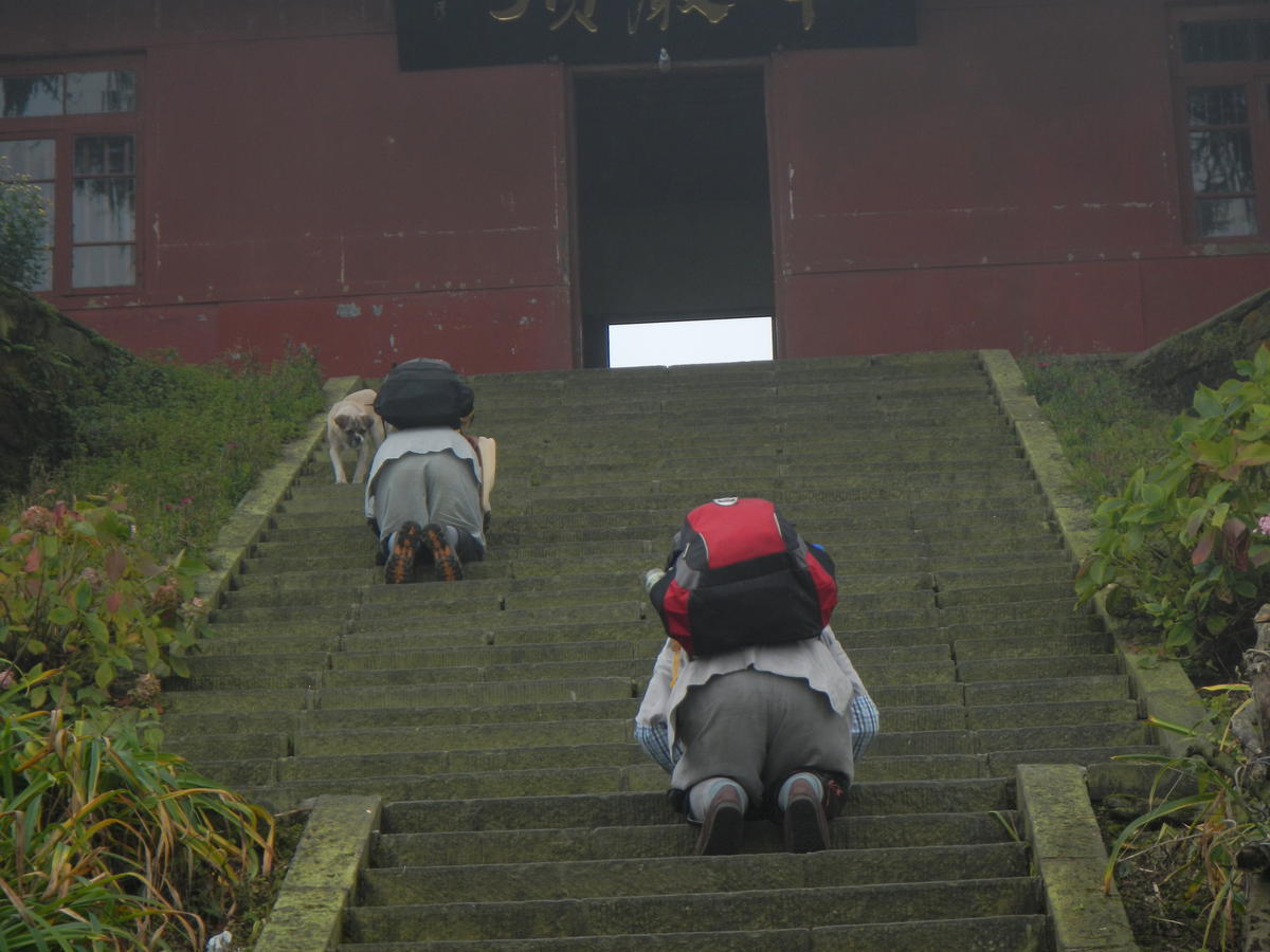 Au dernier temple avant les bus (2/3 du sommet), là où les deux chemins se rejoignent, j'hésite. Je suis fatigué, certes, mais je peux encore continuer. "Si tu t'arrètes maintenant, demain, il faudra encore beaucoup monter avant de devoir tout redescendre... et tu veux descendre par l'autre chemin, le plus long... et tu dois ensuite rentrer à Chengdu en stop". Il faut donc être en bas pas trop tard."