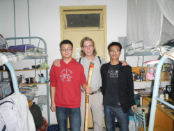 Huan, un étudiant qui était dans le même bus que moi m'aide à trouver le bus 8. Il monte avec moi car il va à l'université de Baoguo, université des signaux de voies ferrées. Il connait l'auberge où je pensais passer la nuit mais il me propose de dormir dans son dortoir, il y a un lit de libre cette nuit. Deux coups de fil, son coloc absent accepte de me préter son lit, ses colocs présents me souhaitent la bienvenue. Il faut juste s'assurer que le surveillant (oui, oui, un surveillant dans les dortoirs universitaires :-) accepte. Je n'ai pas de doute mais mon ami est plus sceptique. Quand on arrive, il est absent, je monte donc poser mes affaires dans leur chambre. Ils sont 4 dans une pièce de 25m2, 4 lits mezzanines qui se font face en deux lignes, les bureaux étant en dessous.