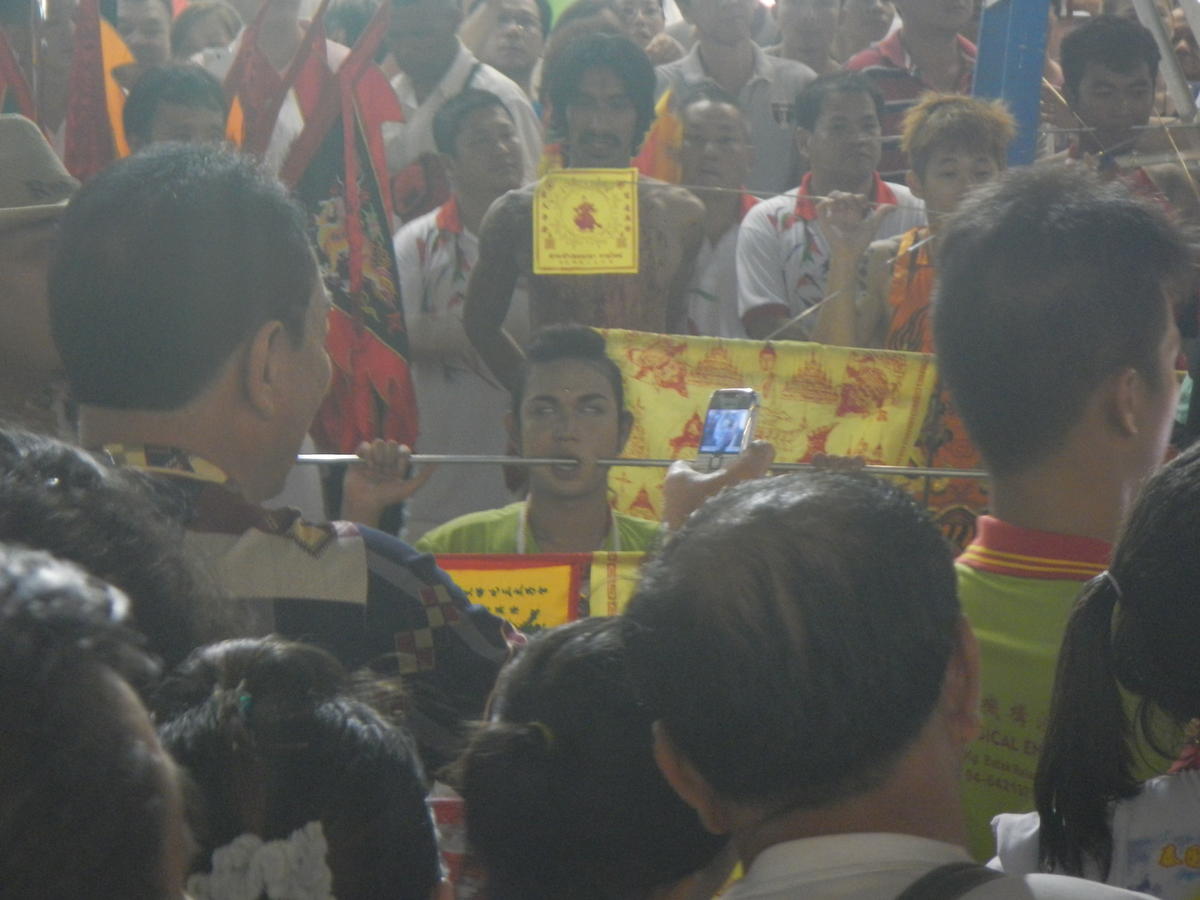 A cause de ça, je ne pouvais pas partir pour la Thaïlande en autostop. Le dernier jour de mon visa malaisien, j'ai du prendre un bus pour la première ville thaï, Hat Yai. Cette ville forme la frontière entre la Thaïlande boudhiste et la Thaïlande musulmane. J'y passe deux jours dans une auberge de jeunesse. J'assiste à une festivité boudhiste des plus étranges, des chars déambulent dans les rues avec de la music, et des hommes qui se sont transpercés la peau avec de longues aiguilles sont "admirés". Je crois que ces hommes sont en transe mais je ne suis pas sûr. La chose étrange, c'est qu'ils ne saignent pas, seulement à la fin quand ils retirent leurs énormes aiguilles.
