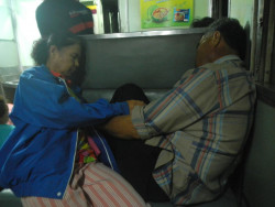 5h de train, assis sur une banquette en plastique dur (j'ai pris la dernière classe évidement), je lis mon livre et regarde le paysage verdoyant et luxuriant de la campagne thaïlandaise. (Philippe, si tu me lis, la Thaïlande en fin de saison des pluies, c'est un autre pays qu'en saison sèche :-) De temps à autre, je me lève et tente de me frayer un chemin entre les paquets et les gens qui restent debouts (toutes les places assises sont loin d'être occupées...). J'ai besoin de me dégourdir les jambes et de reposer mon fessier.